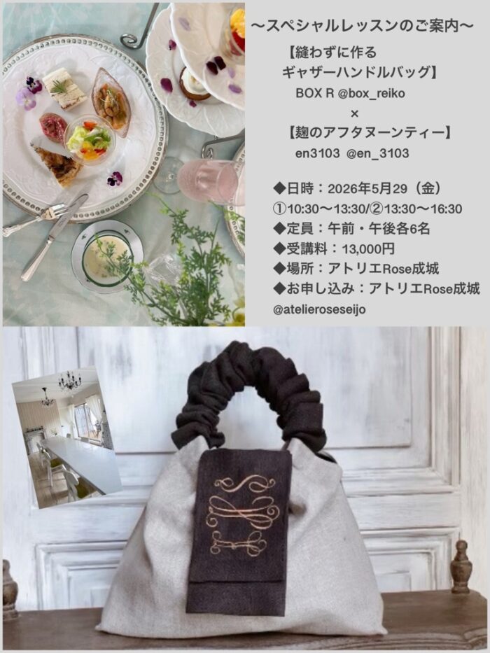 人気カルトナージュ作家「BOX R」の佐野里江子先生 @box_reiko をお招きして、「縫わずに作るギャザーハンドルバッグ」講座を開催いたします。